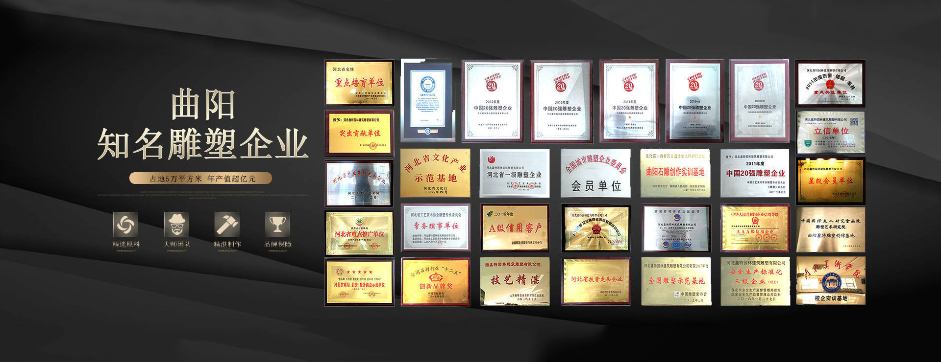 同時(shí),公司也是行業(yè)內(nèi)的佼佼者,連續(xù)七年榮獲“中國20強(qiáng)雕塑企業(yè)”,并被命名為“全國雕塑示范基地”。2017年,曲陽縣河北鑫特園林雕塑公司還被文化部、教育部、人社部命名為“中國非遺石雕傳承人群研培實(shí)訓(xùn)基地”。